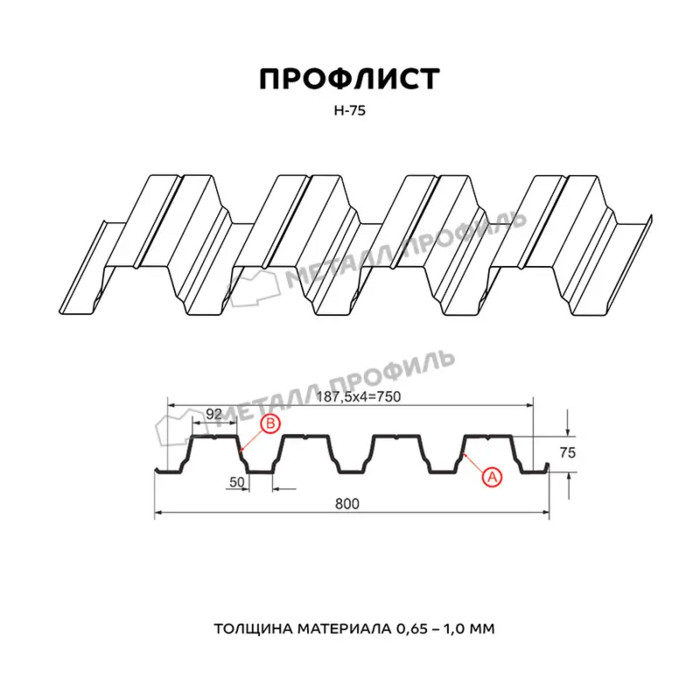 Предлагаем купить профилированный лист Н-75 в Гусь-Хрустальном. Он является оцинкованным стальным материалом, имеющим покрытие. Толщина стальной основы с защитным покрытием составляет 0.8 мм. После проката на специализированном оборудовании лист приобретает рисунок из повторяющихся волн, что значительно увеличивает его жесткость по сравнению с плоским материалом.